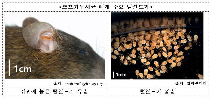 국내에 쯔쯔가무시균을 매개하는 털진드기는 총 8종*으로 알려져 있으며, 2022년도 감시 결과 주로 남부와 일부 북부에서는 활순털진드기가, 중부 및 서부 지역에서는 대잎털진드기가 대표적으로 많은 것으로 확인되었다