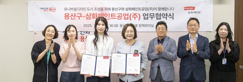 이날 협약식에는 박희영 용산구청장을 비롯해 이상희 삼화페인트공업(주) 컬러디자인센터장, 최성호 용산구 총괄 공공디자이너 등 주요 관계자들이 참석해 포용적 도시환경 조성을 위한 상호 협력 의지를 다졌다.