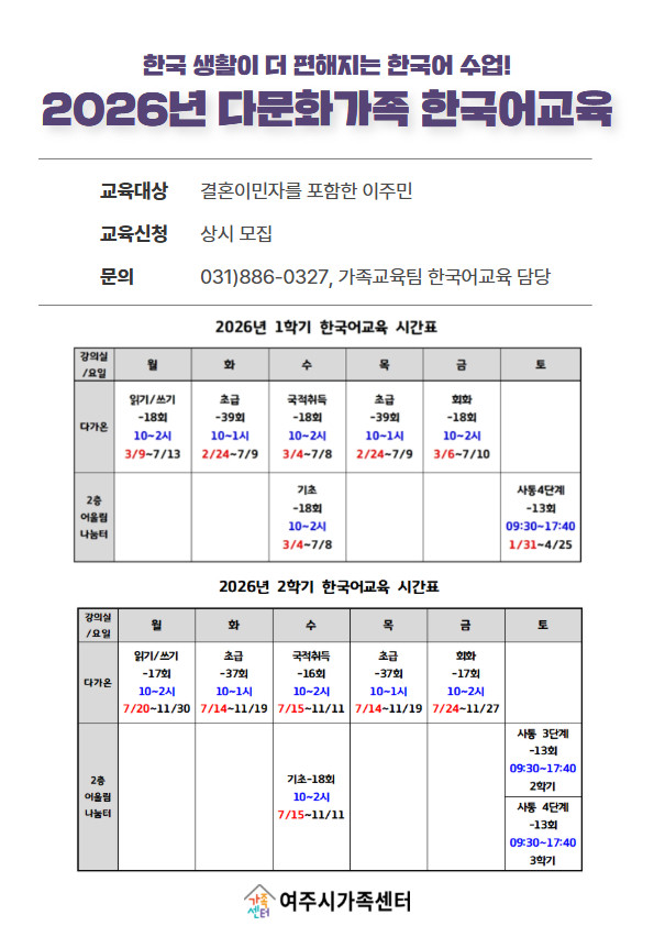 초급반은 2월부터 운영되며, 기초반과 읽기·쓰기반, 국적취득 준비반, 회화반은 3월부터 시작된다. 기타 문의는 여주시가족센터 한국어교육 담당자(☎ 031-886-0327)에게 하면 된다.