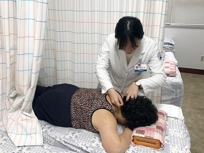 | ▲대전자생한방병원 의료진이 진료소를 찾은 고령 농업인에게 침 치료를 시행하고 있다. |
