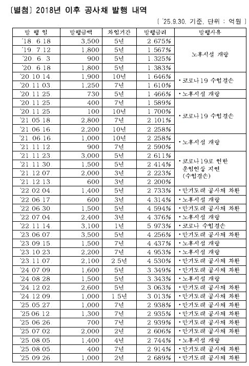 서울교통공사는 최근 수년간 노후시설 개량, 코로나19 기간의 수입 결손 보전, 만기 도래 공사채 차환 등을 이유로 공사채 발행을 지속해 왔다. 교통전문위원실 검토보고서에 따르면 2018년 이후 누적 공사채는 4조 2,480억 원이며 대부분 상환기간은 10년 이내다. [붙임 참고]