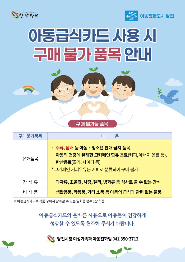 구매 불가 품목으로는 ▲주류, 담배 등 아동‧청소년 판매 금지 품목 ▲아동의 건강에 해로운 고카페인 함유 음료, 탄산음료 등 ▲과자류, 초콜릿, 사탕, 젤리, 빙과류 등 식사로 볼 수 없는 간식 ▲생활용품, 학용품, 기타 소품 등 아동의 급식과 관련 없는 물품 등이다.