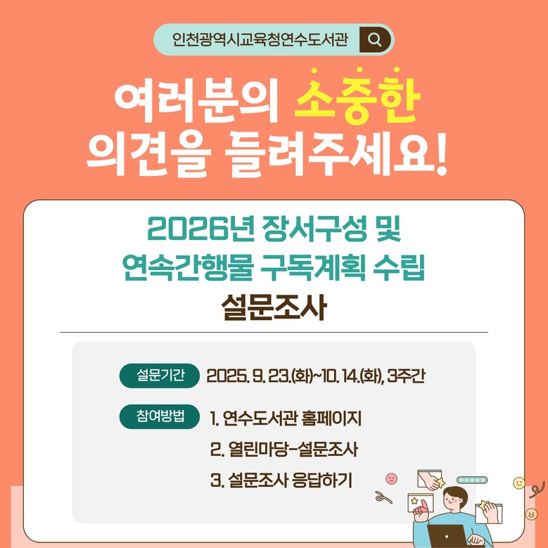 이번 조사는 2026년도 장서 구입과 자료 서비스 개선, 연속간행물 구독 목록 선정에 활용될 예정이며, 연수도서관을 이용하거나 관심 있는 시민이라면 누구나 참여할 수 있다.