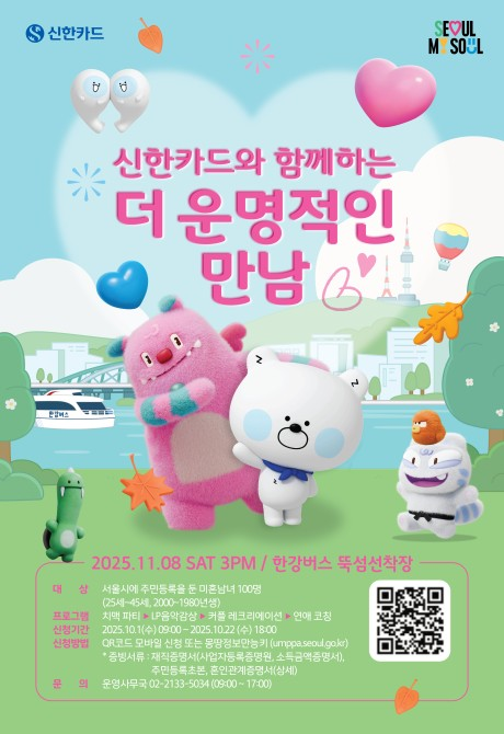 - 서울 거주 25~45세 미혼남녀 100명 대상 10.1부터 10.22까지 온라인 신청 [서울 세계타임즈=이장성 기자] 서울시가 ‘더 운명적인 만남’이라는 새 이름과 함께 올해 마지막 미혼남녀 만남행사를 개최한다. 서울시는 오는 11월8일(토) ‘신한카드와 함께하는 더 운명적인 만남’을 개최한다고 밝히고, 참가자 모집을 위한 신청 접수를 시작한다.