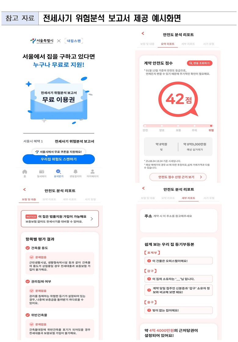 시는 25일(수)부터 서울 지역에서 임대차계약 예정인 만 39세 이하 청년들에게 ‘전세사기 위험분석 보고서’를 제공하며, 1인당 최대 2회까지 이용할 수 있도록 지원한다고 밝혔다.