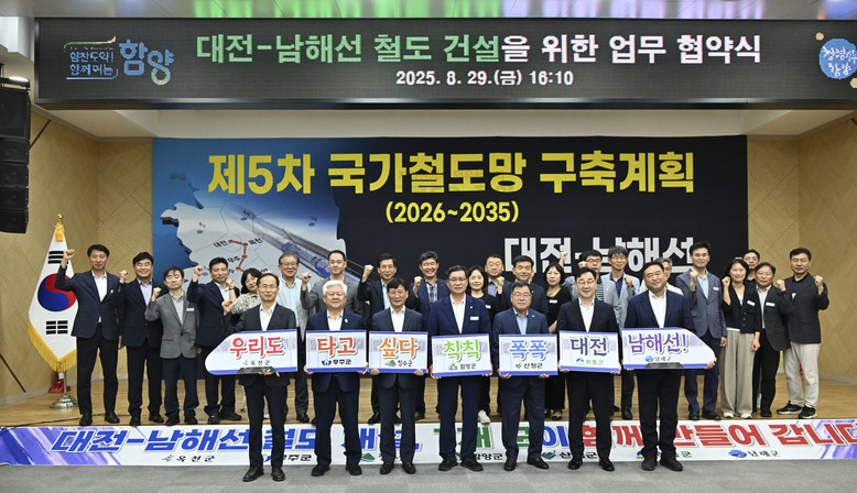 협약안에는 철도 건설사업의 필요성과 타당성 확보를 위한 공동 연구 및 자료 공유, 지역개발 관광 활성화 후속 사업과의 연계 방안 모색 등 대전~남해선 철도사업이 국토교통부에서 수립 중인 제5차 국가 철도망 구축계획에 반영될 수 있도록 공동대응한다는 내용이 담겼다.