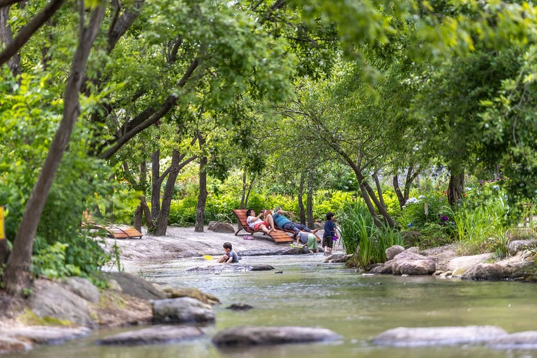 | ▲ 순천만국가정원 개울길에서 관람객이 휴식을 취하고 있다 |