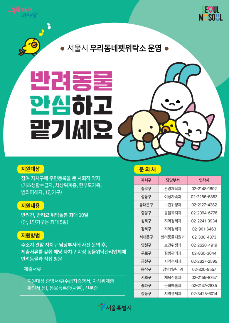 - 14개 자치구 지정 동물위탁관리 31곳…돌봄 최대 10일까지 무료 지원