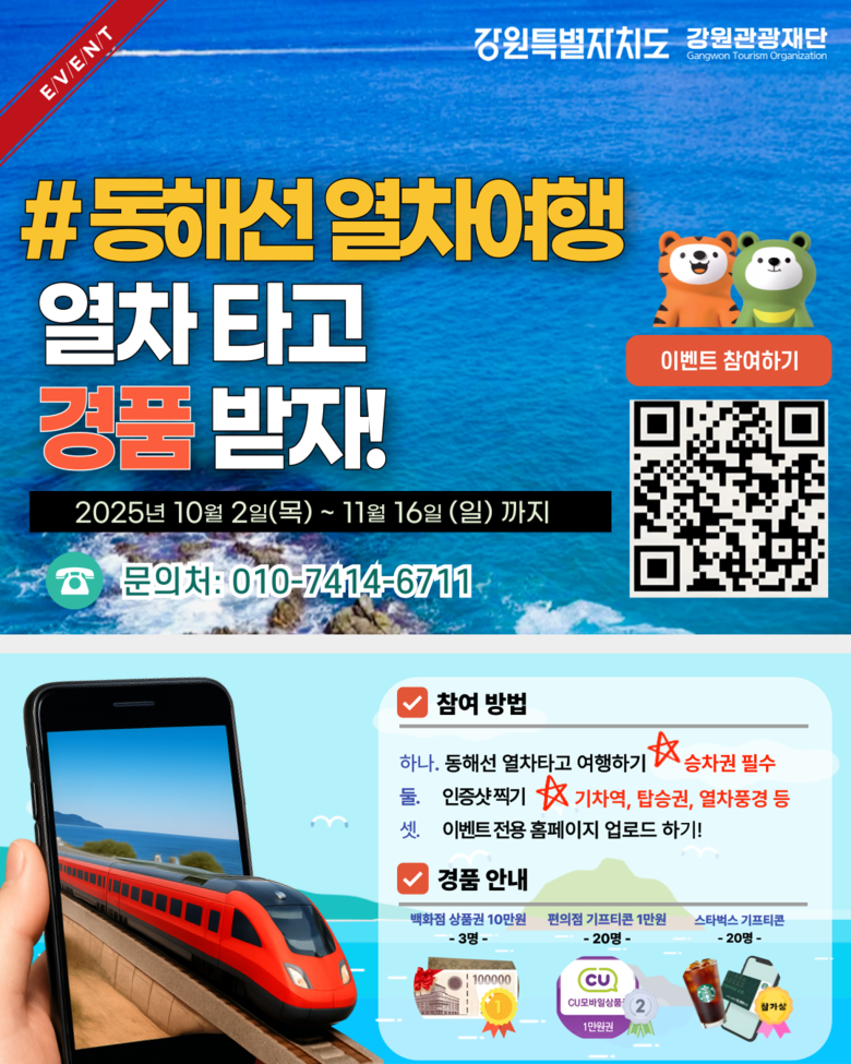 추석 연휴와 가을철 성수기에 맞춰 동해선 철도여행 활성화를 위해 마련된 이번 이벤트는 강릉, 동해, 삼척, 부산 부전역 등 동해선 이용객을 대상으로 하며, 기차역과 열차 내 풍경 등의 사진과 동해선 열차 승차권·영수증을 인증하면 참여할 수 있다.