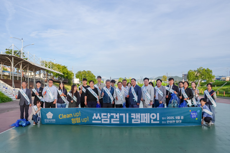 [안성시 세계타임즈=송민수 기자] 안성시의회(의장 안정열)는 22일 오후 전 의원 및 직원들이 함께하는 『clean up! 청렴 up! 쓰담걷기 캠페인』을 안성천 일대에서 실시했다고 밝혔다.
