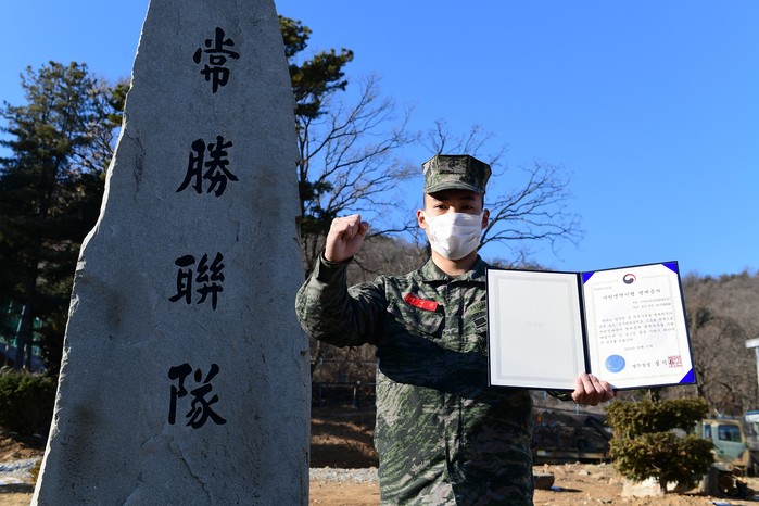 | ▲ 해병대 2사단 5여단 정보중대 이재진 병장이 한 손에 자원병역이행 명예증서를 들고 파이팅을 외치고 있다. ▲촬영: 하사 최태준 |
