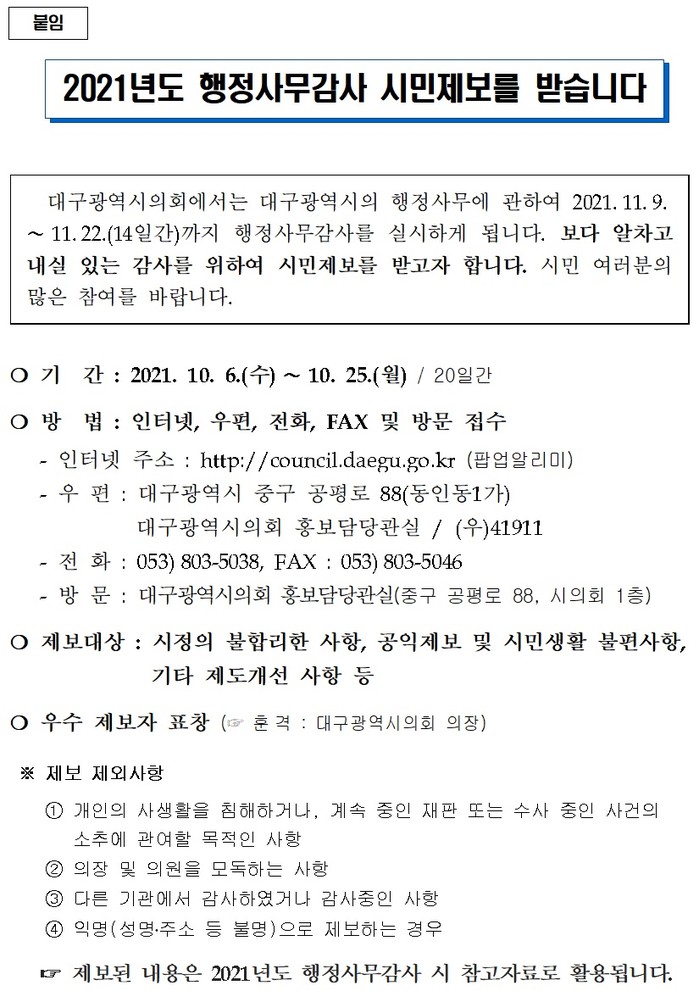 대구시의회는 오는 11월 9일부터 22일까지로 예정된 올해 행정사무감사를 효율적이고 내실있게 추진하고자, 10월 6일부터 25일까지 시정의 불합리한 사항, 생활 불편 사항, 기타 제도개선 사항 등 대구시정 전반에 대해 시민들의 제보를 받는다.