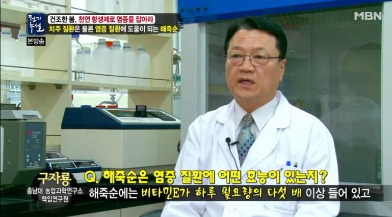 해죽순 봉우리 차로 면을 삶으면 면이 잘 붙지 않고 냄새나는 음식에 사용 시 냄새를 잡아주며 취향에 따라 진하게 또는 연하게 수시로 물 대용을 마시면 좋다.특히 염증이 있는 분들은 진하게 따려서 마시면 좋고 해죽순은 특별한 부작용은 없다고 하니 염증이 있으신 분께 적극 추천하다.고 했다.