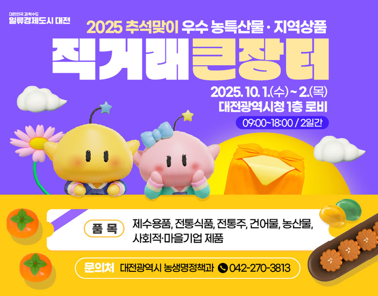 이번 장터에는 대전 지역을 비롯해 금산·청양·홍성·예산·영동 등 인근 시군의 55개 농가와 업체가 참여한다. 제수용품과 명절 선물세트가 시중 가격보다 10~20% 저렴하게 판매되며, 사회적기업과 마을기업이 함께해 전통식품과 특색 있는 지역상품도 선보인다. 특히 대전 대표 명물인 ‘꿈돌이 호두과자’도 현장에서 만나볼 수 있다.