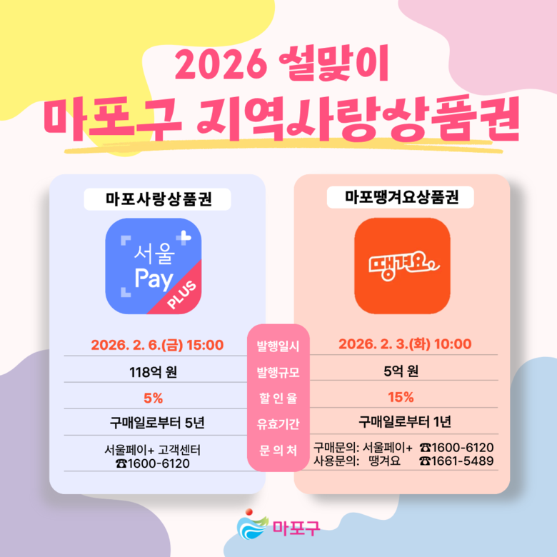 박강수 마포구청장은 “새해 첫 발행되는 마포사랑상품권과 마포땡겨요상품권이 구민들의 가계 부담을 덜고, 소상공인에게는 매출 증대에 도움이 되어 모두가 따뜻하고 풍요로운 설 명절을 보내시길 바란다”고 말했다.