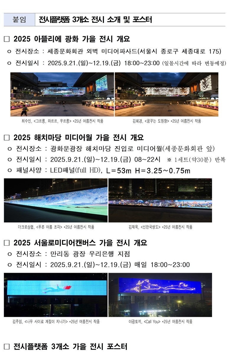 서울시는 9월 21일(일)부터 12월 19일(금)까지 매일 밤(18시~23시) 3곳(▴아뜰리에 광화 ▴해치마당 미디어월(08~22시) ▴서울로미디어캔버스)의 ‘미디어아트 서울’ 가을 전시를 통해 계절의 아름다움을 담아낸 작품들로 시민들의 문화적 일상을 풍요롭게 한다.