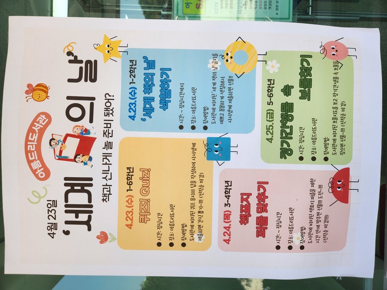 점심시간, 아이들의 발길이 끊이지 않는 아름드리도서관은 매일 새로운 이야기와 즐거움으로 가득하다. 첫날인 23일, 형형색색의 크레파스와 사인펜이 1-2학년 꼬마 예술가들의 손에서 춤을 추며 ‘세계 책의 날’ 글자를 아름답게 채색하는 ‘세계 책의 날 컬러링’이 진행되었다. 한편, 도서관 한 켠에서는 ‘날짜의 정체를 밝혀라!!!’ 퀴즈에 참여하기 위한 전 학년 학생들의 열띤 경쟁이 펼쳐졌다. 숨겨진 힌트를 찾고 정답을 외치는 아이들의 눈빛은 책에 대한 호기심으로 반짝였다.