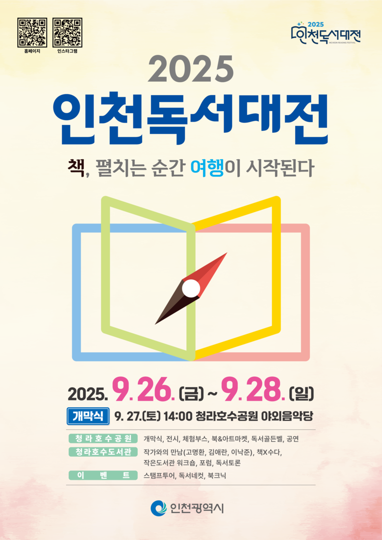 - 세대와 계층을 아우르는 시민 화합의 독서축제로 일상 속 독서문화 확산 - [인천 세계타임즈=심하린 기자] 인천광역시(시장 유정복)는 오는 9월 26일(금)부터 28일(일)까지 3일간 청라호수공원 야외음악당과 청라호수도서관에서 ‘2025 인천 독서대전’을 개최한다고 밝혔다.