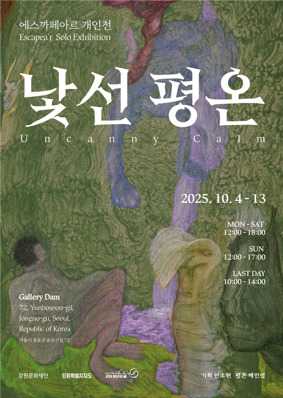 ・ ‘응시와 집중’을 통한 자기 고백적이고도 시의적인 시선 [강원도 세계타임즈=김민석 기자] 강원문화재단(대표이사 신현상)이 지원하는 청년예술인 에스까페아르(ESCAPEAR)의 여섯 번째 개인전 《낯선 평온》이 오는 10월 4일(토)부터 13일(월)까지 서울 종로구 갤러리 담에서 열린다.