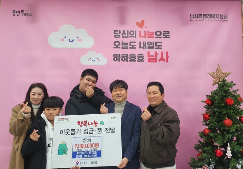 ▲ 축구동호회인 ‘처인성FC’와 회원 원정훈씨 가족은 지난해 12월 29일 어려운 이웃을 위해 성금 200만 원을 남사읍에 기탁했다.