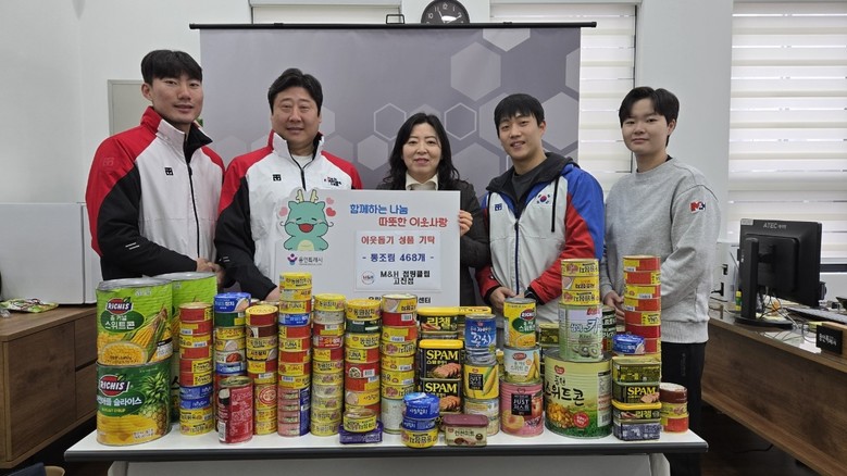 ▲ M&H 점핑클럽 고진점은 지난해 12월 29일 회원들과 지역사회 나눔을 실천하고자 통조림 468개를 모아 유림2동에 기탁했다.