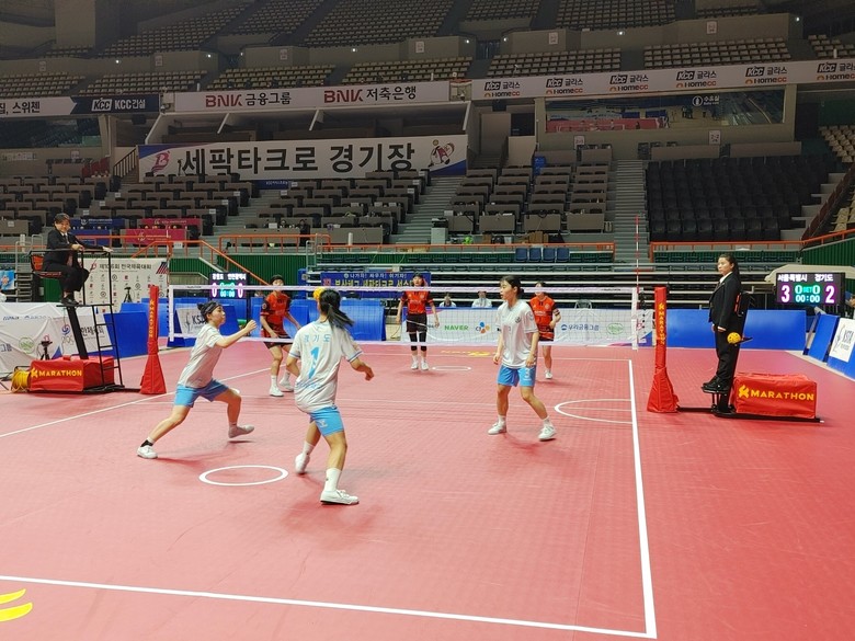 | ▲세팍타크로 여자18세이하부 단체전 경기도(풍무고) 대 서울(창문여고) 준준결승경기 모습. |