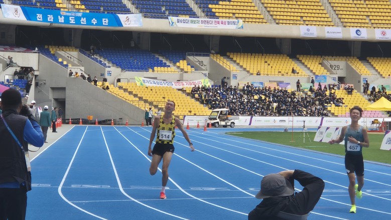 | ▲지난 21일 '제106회 전국체전'남자대학교 하프마라톤 결승전이 진행된 가운데 선수들이 결승선을 통과하고 있다. |