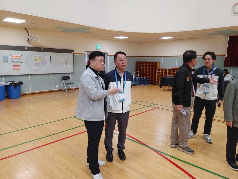 | ▲지난 20일 김택수 총감독이 해운대교육지원청 스포츠센터에서 경기도 댄스스포츠 연맹 함갑주 상임부회장을 만나 격려와 함께 현장을 둘러보고 있다. |