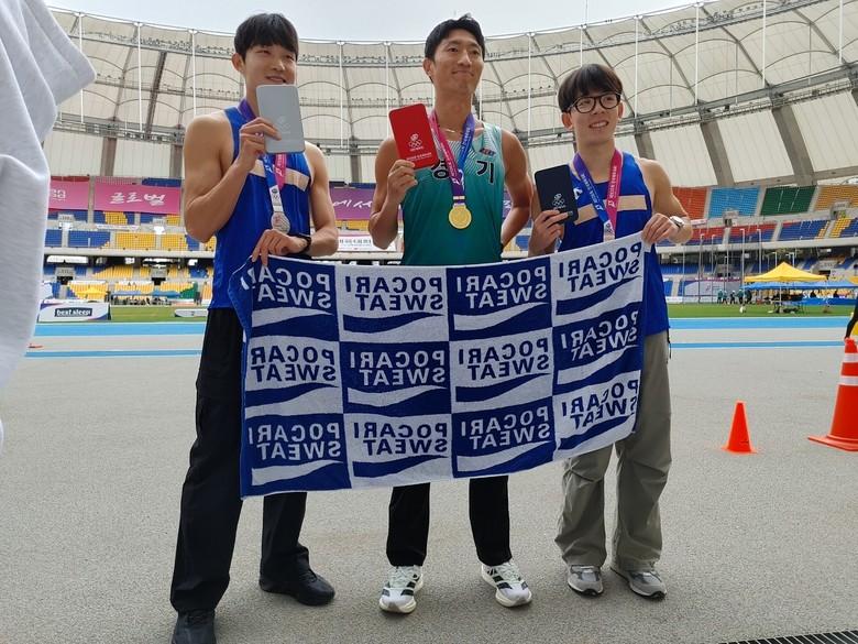| ▲육상(로드레이스) 남자일반부 20KM경보 메달 수상자들이 기념촬영하고 있다_가운데 1위 경기도 최병광(삼성전자) 선수. |