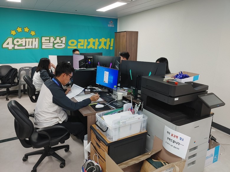 | ▲부산 아시아드주경기장 내 경기도 상황실에서 도체육회 관계자들이 경기도 선수단이 최상의 경기력을 펼칠 수 있도록 실시간 모니터링하며 근무하고 있는 모습. |