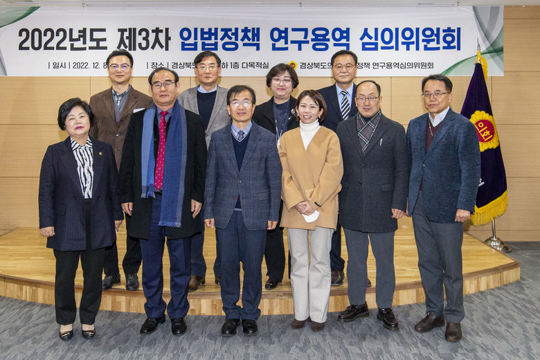 [경북 세계타임즈=한성국 기자] 경상북도의회는 12. 8.(목) 의회 다목적실에서 2022년도 제3차 입법정책 연구용역 심의위원회를 개최하여, 각 연구단체로부터 제안된 2건의 연구과제에 대해 심도 있게 논의했다.