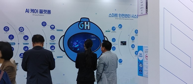 | ▲26일 열린 ‘월드시티테크 엑스포’에서 관람객들이 GH의 AI케어 플랫폼 및 스마트 안전관리 시스템의 설명을 듣고 있다. |