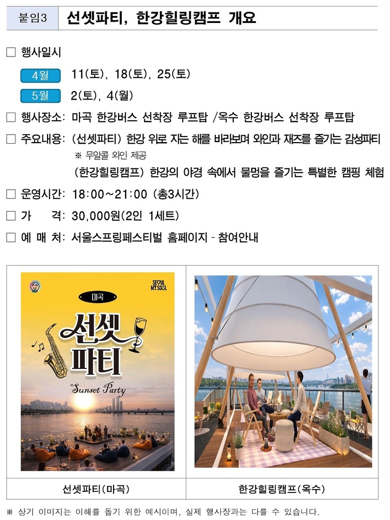 ‘선셋파티’는 마곡 한강버스 선착장 루프탑에서 핑거푸드와 함께 노을과 공연을 즐기는 프로그램이며, ‘한강 힐링캠프’는 옥수 선착장에서 간단한 캠핑 음식과 함께 휴식과 여유를 경험할 수 있다.