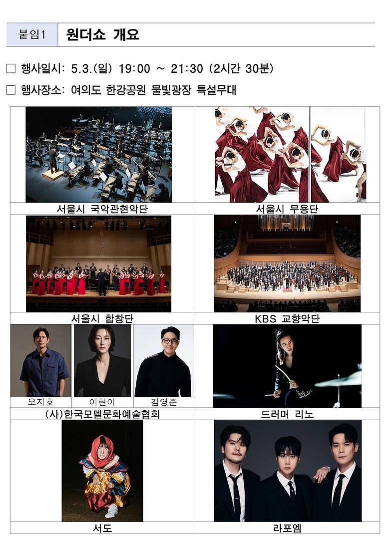 ‘원더쇼'는 5월 3일(일) 오후 7시 30분, 여의도 한강공원 물빛광장 특설무대에서 개최되며, 서울을 대표하는 K-컬처 공연 콘텐츠로 운영되어 시민과 관광객들에게 한강의 야간 경관과 어우러진 문화예술 체험 경험을 제공할 예정이다.