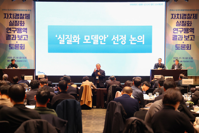 [서울 세계타임즈=이장성 기자] 전국 시도자치경찰위원장협의회(전라남도자치경찰위원회 정순관 회장)는 지난 1월 16일(금), 서울에서 ‘자치경찰제 실질화 연구용역 결과 보고 및 토론회’를 개최했다. 서울특별시자치경찰위원회와 전라남도자치경찰위원회가 공동 주관한 이번 토론회는 현 정부의 핵심 국정과제인 ‘이원화 자치경찰제 단계적 시행’을 앞두고, 전국 시도자치경찰위원회가 지향하는 ‘완전한 자치경찰제’의 구체적인 방향을 공유하고 공동 대응 방안을 모색하기 위해 마련되었다.
