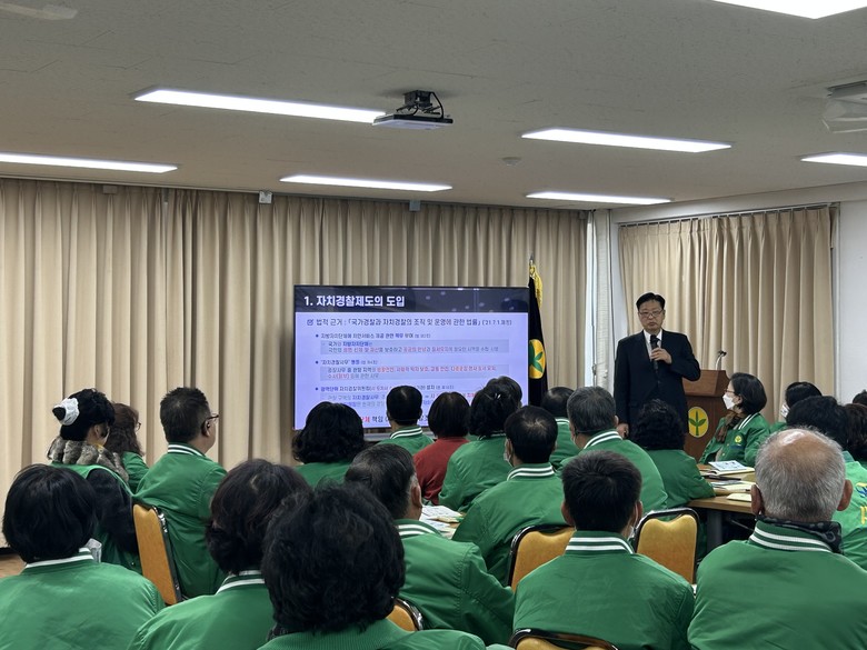 이날 교육에는 김영배 도 자치경찰위원회 사무국장이 강사로 참여해 시민들이 자치경찰 제도의 역할과 기능을 이해할 수 있도록 도입 배경과 성과, 주민 참여 방안 등을 설명했다.