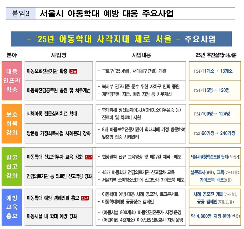 한편, 서울시는 그간 아동이 안전하고 존중받는 서울을 만들기 위해 아동학대 예방을 위한 다양한 사업을 지속적으로 강화해왔다. 올해는 아동보호전문기관 2개소를 신규 개소하고, 아동학대전담공무원 인원 확충, 피해아동 전문심리치료 지원대상 확대 등을 통해 예방, 치료, 가족 회복까지 빈틈없는 대응체계 구축을 위해 노력하고 있다.