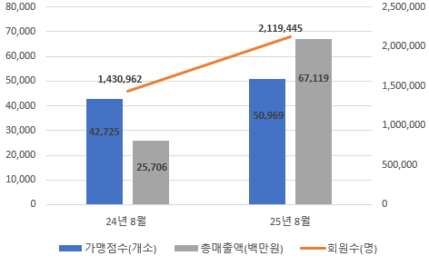 한편, 공공배달 서비스 ‘서울배달+땡겨요’는 낮은 중개수수료(2%)와 광고비 부담 없는 운영구조, 다양한 소비자 할인 혜택을 바탕으로 빠르게 성장하고 있다. 2025년 8월 기준 전년 동월 대비 회원 수(2,119,445명)는 48.1%(약 1.5배), 가맹점 수(50,969개소)는 19.3%(약 1.2배), 누적 매출액(671억 1,900만원)은 161.1%(약 2.6배) 증가했으며, 모든 지표가 상승세를 보이며 지속적인 확장세를 기록 중이다.