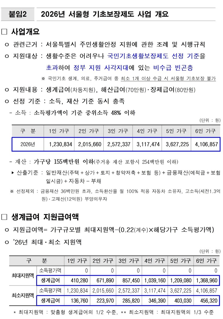 서울형 기초보장제도 수급자 선정 기준은 ▴국민기초생활보장 수급자가 아니면서 ▴소득평가액이 기준 중위소득 48% 이하이고 ▴재산이 가구당 1억 5,500만 원(주거용 재산 포함 시 2억 5,400만 원) 이하여야 한다.