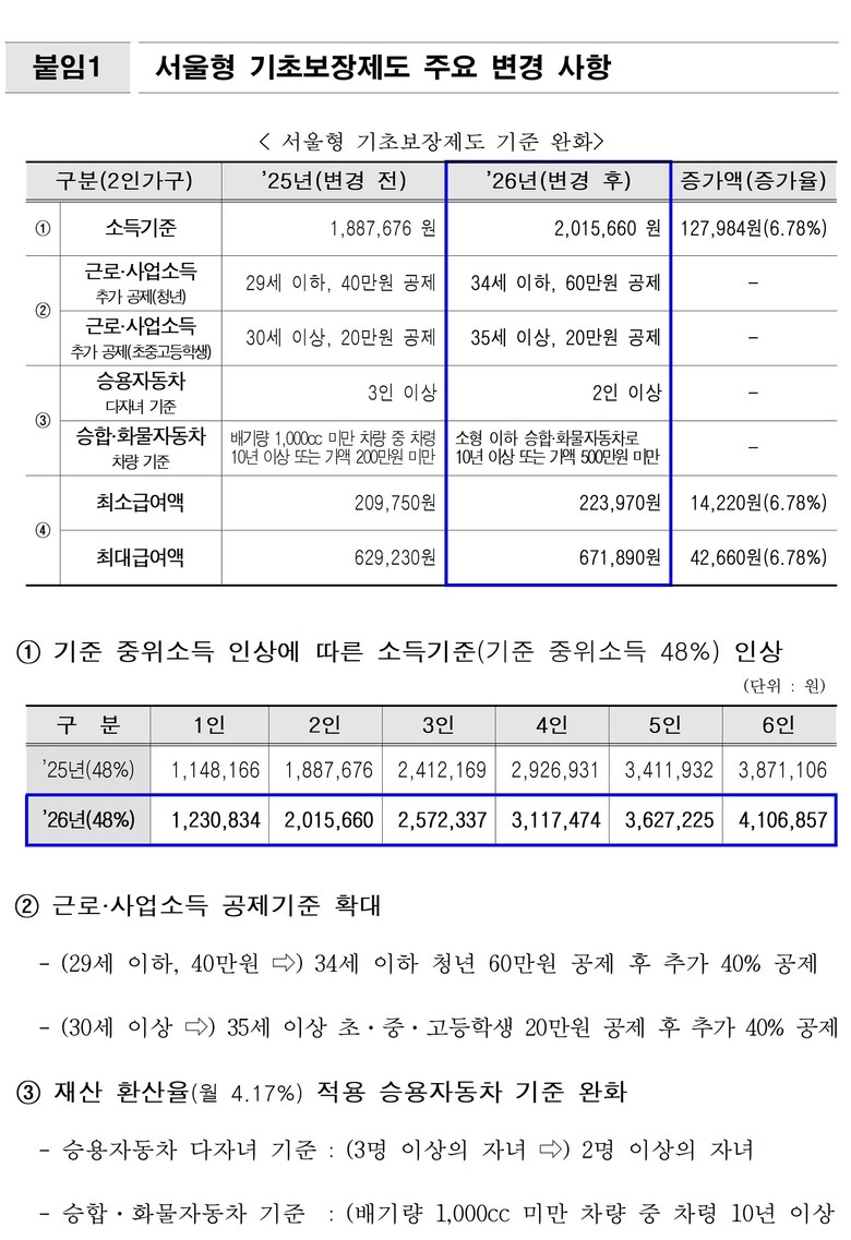 올해 서울형 기초보장제도의 주요 변화는 ▴생계급여액 상승 ▴청년 적용 연령 및 이들에 대한 근로·사업소득 공제액 확대 ▴자동차 재산 기준 완화 등이다.