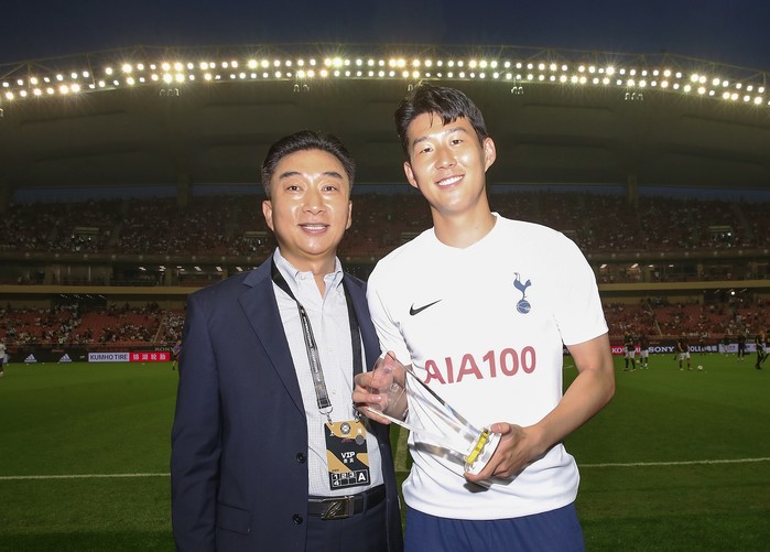 [세계타임즈 이광원 기자]2019년7월28일 –지난25일중국상하이훙커우축구경기장에서개최된‘2019 인터내셔널챔피언스컵(ICC)’경기에서한국AIA생명대표와토트넘핫스퍼선수중유일한한국인인손흥민선수가나란히단상에서는훈훈한장면이연출됐다.