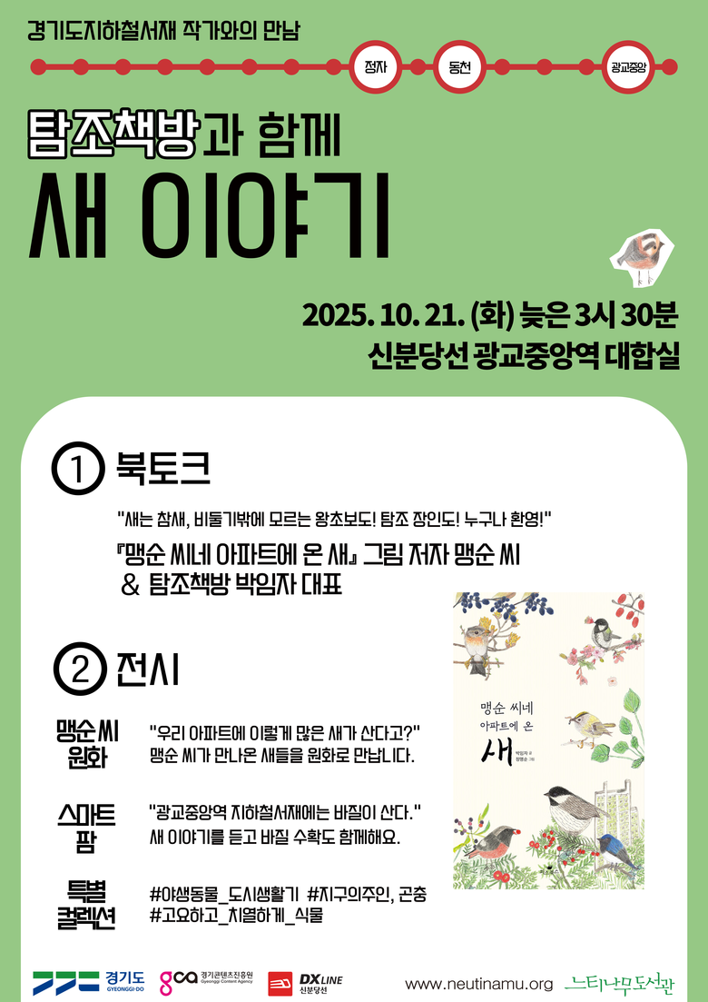 북토크에는 KBS 다큐멘터리 ‘울 엄마 맹순 씨의 새들처럼’의 실제 주인공이자 ‘맹순 씨의 아파트에 온 새’ 그림 저자인 맹순 씨와 탐조책방 박임자 대표가 참여한다. 두 강연자는 아파트 숲에서 새와 이웃이 된 사연과 그 과정을 기록한 이야기를 들려주며 참가자들과는 ‘내가 만난 새 이야기’, ‘나만의 탐조 경험’, ‘도심 속 야생동물과 공존하는 방법’ 등을 자유롭게 나눌 예정이다.