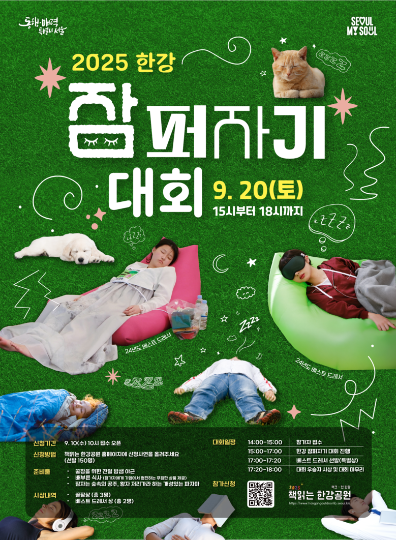 - 1위는 100만 원 상당 상품… 1~3위 시상, 베스트 드레서 3명은 시민 투표로 선정 [서울 세계타임즈=이장성 기자] 지난해 봄, 전국의 ‘잠 고수’ 100명이 모여 열띤 경쟁을 펼친 ‘한강 잠퍼자기 대회’가 올해는 150명 규모로 확대되어 가을에 찾아온다. 서울시는 오는 20일(토) 오후 3시, 여의도 한강공원 멀티플라자에서 “책만 보면 잠 오는 사람 모여라”를 주제로 ‘2025 한강 잠퍼자기 대회’를 개최한다고 밝혔다.