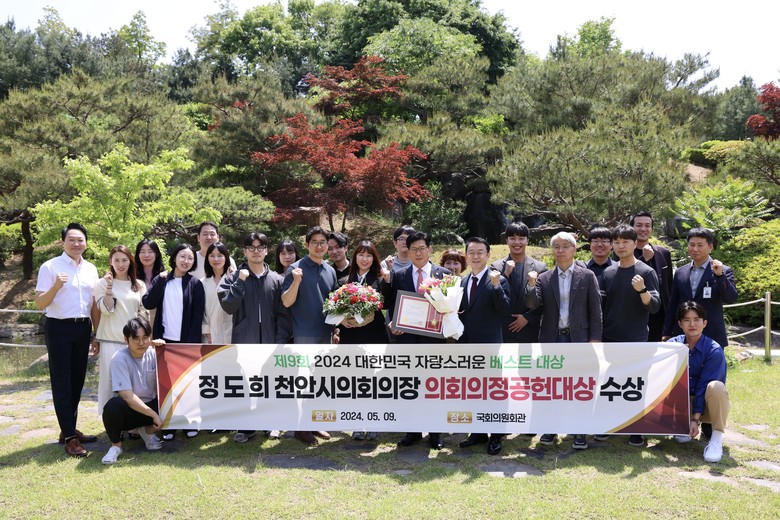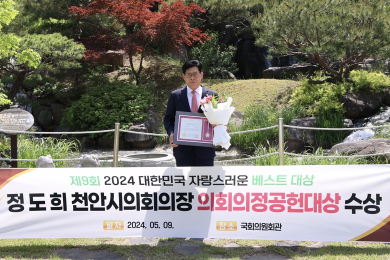 [천안시 세계타임즈=백택기 기자] 정도희 천안시의회 의장은 9일 국회의원회관 소회의실에서 대한민국 자랑스러운 베스트혁신위원회에서 주최한 ‘제9회 2024 대한민국 자랑스러운 베스트대상 시상식에서 의회의정공헌대상 수상의 영예를 안았다.