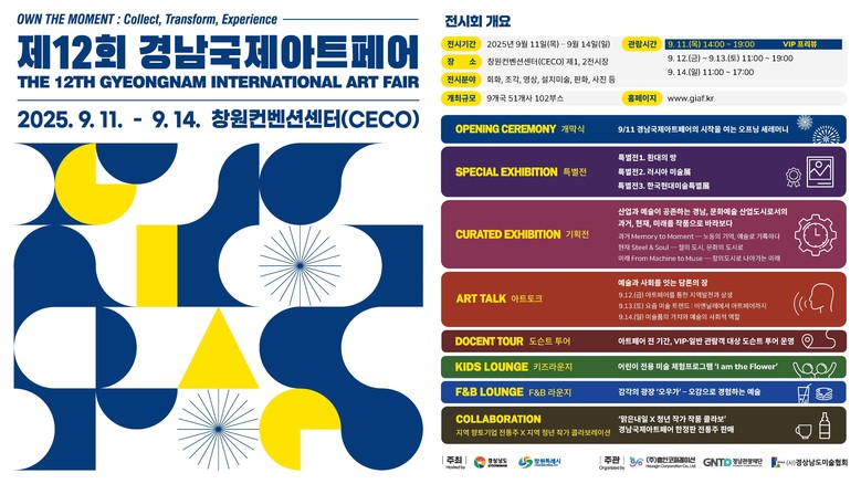 - 특별전, 기획전, 아트토크 등 다채로운 프로그램 마련 [세계타임즈=경남 최성룡 기자] 경상남도(도지사 박완수)는 오는 9월 11일부터 14일까지 4일간 창원컨벤션센터(CECO)에서 경남을 대표하는 국제 미술 축제인 “제12회 경남국제아트페어(GIAF 2025)”가 개최된다고 밝혔다.