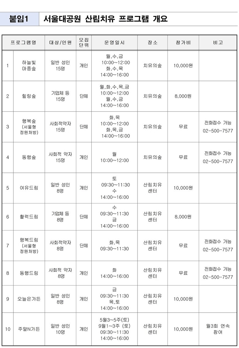 서울대공원 산림치유·서울형정원처방 프로그램은 회차당 8~15명 예약제로 서울시공공서비스예약시스템 누리집을 통해 신청할 수 있으며 사회적 약자 대상 프로그램은 전화예약도 가능하다.