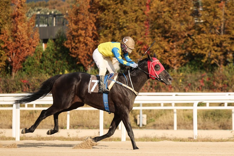 [세계타임즈 = 송민수 기자] 화창한 날씨 속 11월 3일(일), 한국마사회(회장 정기환) 렛츠런파크 서울 제7경주로 펼쳐진 ‘제13회 서울경제신문배’(국4등급, 연령성별오픈, 1600m, 레이팅 50이하, 순위상금 6천만 원)에서 ‘선더호스’(한국 6세 수 흑갈색 레이팅38 김광명 마주 안병기 조교사)가 오수철 기수와 함께 노장의 투혼을 발휘하며 깜짝 우승을 차지했다.