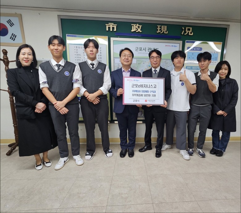 [군포시 세계타임즈=송민수 기자] 군포e비즈니스고등학교(교장 장인섭) 마케팅과 학생들이 ‘청소년 비즈쿨(Biz-Cool)’ 창업체험 교육을 통해 얻은 수익금 전액을 군포시청에 기탁했다.