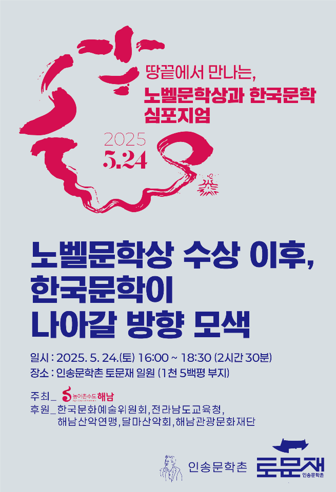 오는 5월 24일 오후 4시부터 6시 30분까지, 전남 해남군 송지면에 위치한 인송문학촌 토문재에서 ‘노벨문학상 수상 이후, 한국문학이 나아갈 방향 모색’ 을 테마로 한 심포지엄이 개최된다.