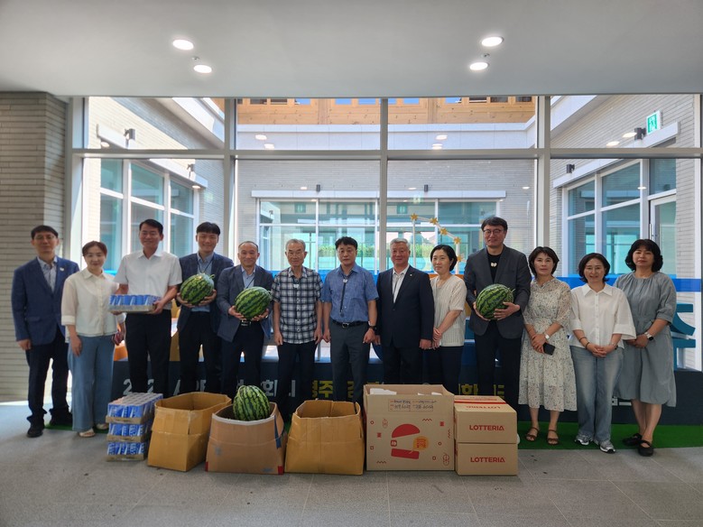 이날 APEC 준비지원단 사무실을 직접 찾은 APEC범시도민지원협의회의 공동회장인 박몽룡 및 이상걸 회장은, 연일 계속되는 폭염속에서 직원들이 잠시나마 더위를 잊고 휴식을 취하기를 바라는 마음으로 수박, 햄버거 등 직원 간식을 직접 챙겨 방문하고, 직원들과 일일이 인사를 나누며 응원했다.
